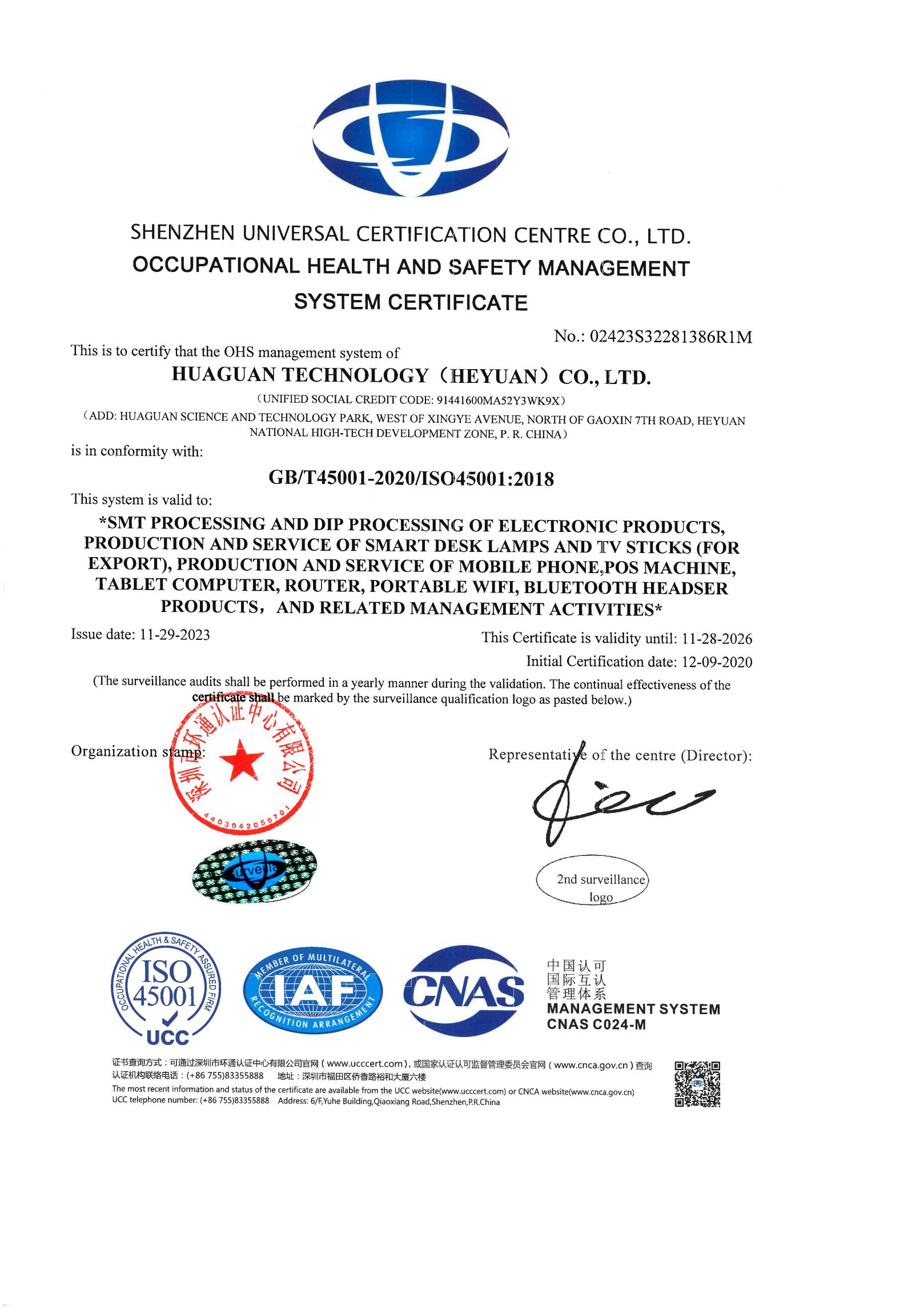 華冠ISO45001健康安全管理體系證書(英文)